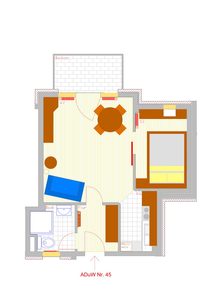 Aufteilung: Wohnzimmer mit Balkon, Bibliothek, Sitzgruppe, Essplatz mit rundem Tisch, Schlafzimmer mit Fenster und franz. Doppelbett (140x200cm), Duschbad mit WC und Fenster, eine separate Küche mit Kochzeile runden die Wohnung ab. Das Schlafsofa im Wohnzimmer bietet zusätzlich eine Schlafmöglichkeit für 1 Person.