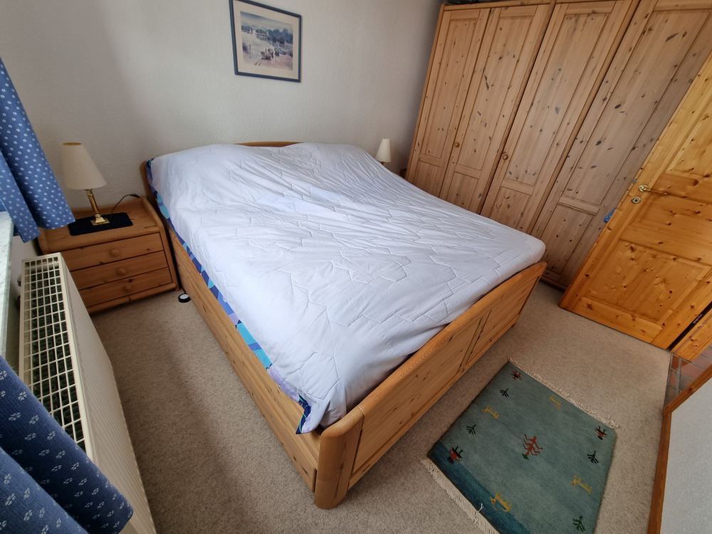 Aufteilung: Der Bungalow verfügt über 2 Schlafzimmer: 1. Schlafzimmer: 1,80m x 2m Bett mit jeweils zwei 90cm x 2m Matratze mit elektrisch verstellbaren Lattenrosten 2. Schlafzimmer: 1,20m x 2m Bett mit einer Matratze mit elektrisch verstellbarem Lattenrost (Bettlaken 1,40x2m passt hier auch), ein geräumiges Wohnzimmer mit 2 hochwertigen Ledersofas und einem Sessel, ein Esstisch mit 4 Stühlen, einem Duschbad mit WC, Lichtkuppel und bodenebener Duschtasse und einer neuen, sehr hochwertig ausgestatteten Küche. Ein PKW Stellplatz befindet sich direkt vorm Haus.