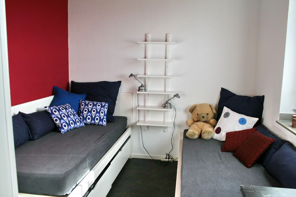 Aufteilung: Großes, modern eingerichtetes Wohnzimmer mit Schlafcouch (für 2 Personen)und Essbereich, Tür zur Terrasse. Schlafzimmer mit Doppelbett, Schlafzimmer mit 2 Einzelbetten, Dusche mit WC und Lichtkuppel. Alle Fenster mit weißen Plissees (Lichtdurchlässig, aber blickdicht); in Schlafzimmern zusätzliche abdunkelnde Vorhänge.Gut ausgestattete Küche, PKW Stellplatz und Garage.