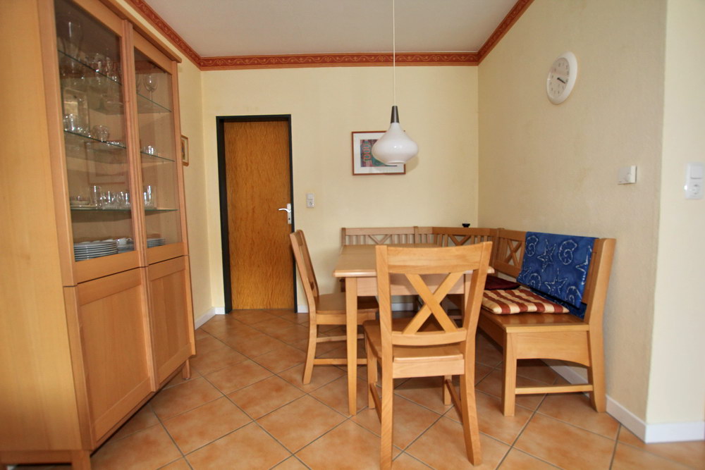 Gut eingerichtete Reihenhaus Wohnung mit Terrasse im Reihenhaus mit nur drei Wohneinheiten im Ort auf Gartengrundstück ruhig und doch zentral gelegen. Spielwiese für alle mit Schaukel und Sandkasten vor dem Haus und von der Terrasse einzusehen. Zugang zur Strasse für Kleinkinder abgesperrt.