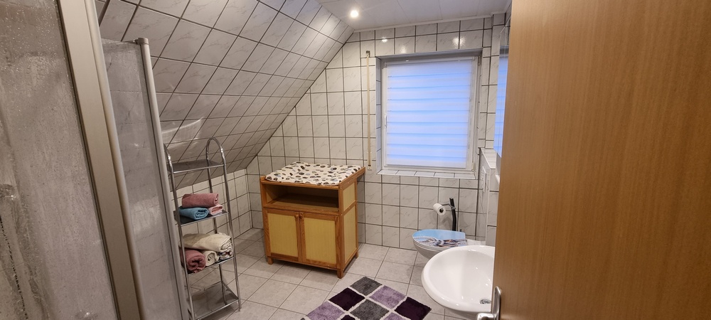 Unter der Treppe befindet sich zusätzlicher Stauraum mit Terrassenauflagen, einem Kinderhochstuhl, Bügelbrett sowie weiteren praktischen Utensilien. Über die Treppe rechts neben dem Eingangsbereich gelangen Sie in das Obergeschoss. Dort stehen Ihnen ein neu renoviertes Zweibettzimmer, ein weiteres ebenfalls renoviertes Doppelzimmer mit Kinderbett sowie ein teilweise neu gestaltetes Duschbad mit bodengleicher Dusche, WC und Wickeltisch zur Verfügung. Sämtliche Matratzen in den Schlafräumen sind mit komfortablen Toppern ausgestattet.